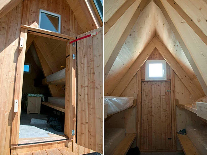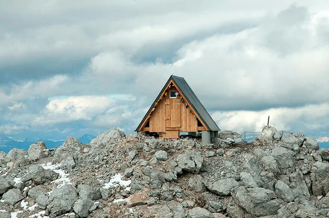 This place lies on a fine line between a vision and faith. This cabin was erected by 12 climbers that had materials heli-ed onto this mountain peak within the Julian Alps. It serves as a hostile refuge for climbers and was commissioned by the family of mountain guide Luca Vuerich, who was tragically killed in an avalanche.